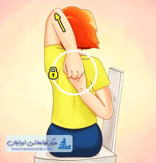 باید یک دست را در پشت کمر خودتان قرار داده، و دست دیگران را بلند کنید. از پشت سر دستتان را به پشت کمرتان نزدیک نموده، و انگشتان خود را در هم قفل کنید. این حرکت را به گونه ای انجام دهید، که آرنجتان بالا کشیده شود و به مدت ۵ ثانیه دست های خودتان را در این حالت قرار دهید.